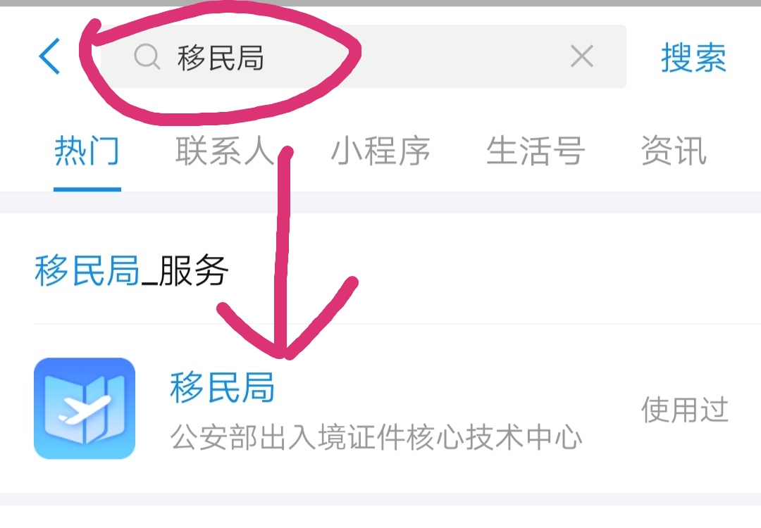 首先,在支付宝首页的搜索框中输入“移民局”,然后就会出现移民局的小程序,如下图: